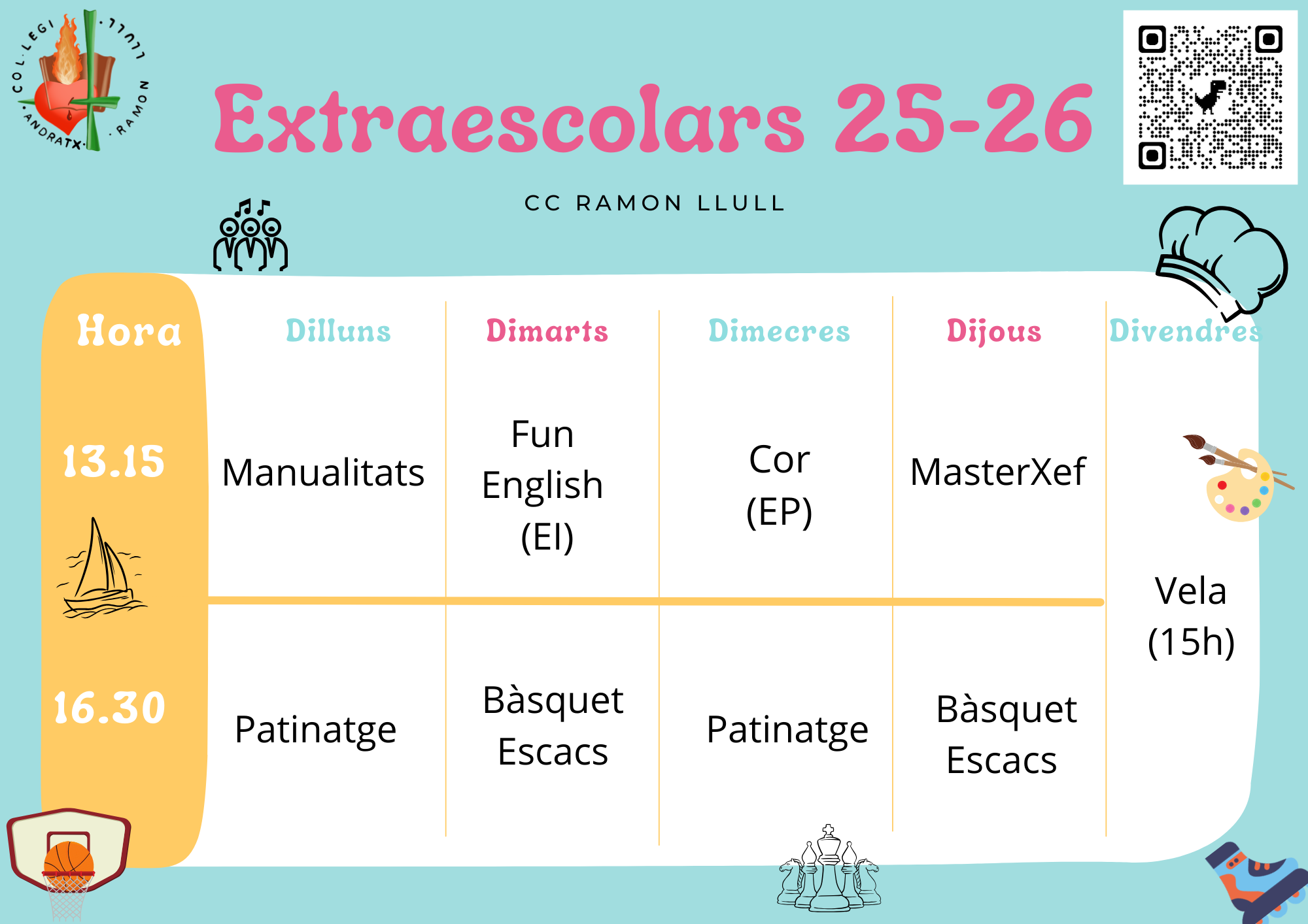 El centro ofrece servicio de extraescolares en horario de mañana y tarde. Las actividades de mañana están gestionadas por el centro y las de las tardes por asociaciones colaboradoras (Club Basket Andratx, Club de vela, etc). Las actividades se inician el més de Octubre y están sujetas al número de integrantes del grupo.